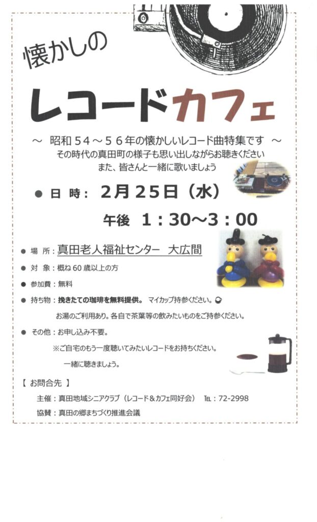 懐かしのレコードカフェのお知らせ 2026年1月30日カテゴリ:お知らせ 2月25日(水) 真田老人福祉センターでレコードカフェを開催します。参加費無料。挽きたての珈琲を提供します。概ね60歳以上の方、ぜひご参加ください。